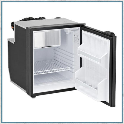 The Indel B Cruise 65 refrigerator has a 65 litre capacity and includes a small freezer compartment, adjustable thermostat, inner light, wire shelf, and two inner door balconies. Its fan-cooled compressor unit is integrated on the upper rear, allowing for a more compact design. Perfect for storing half litre bottles and cans, with the added option to lift one side of the shelf for taller bottles.