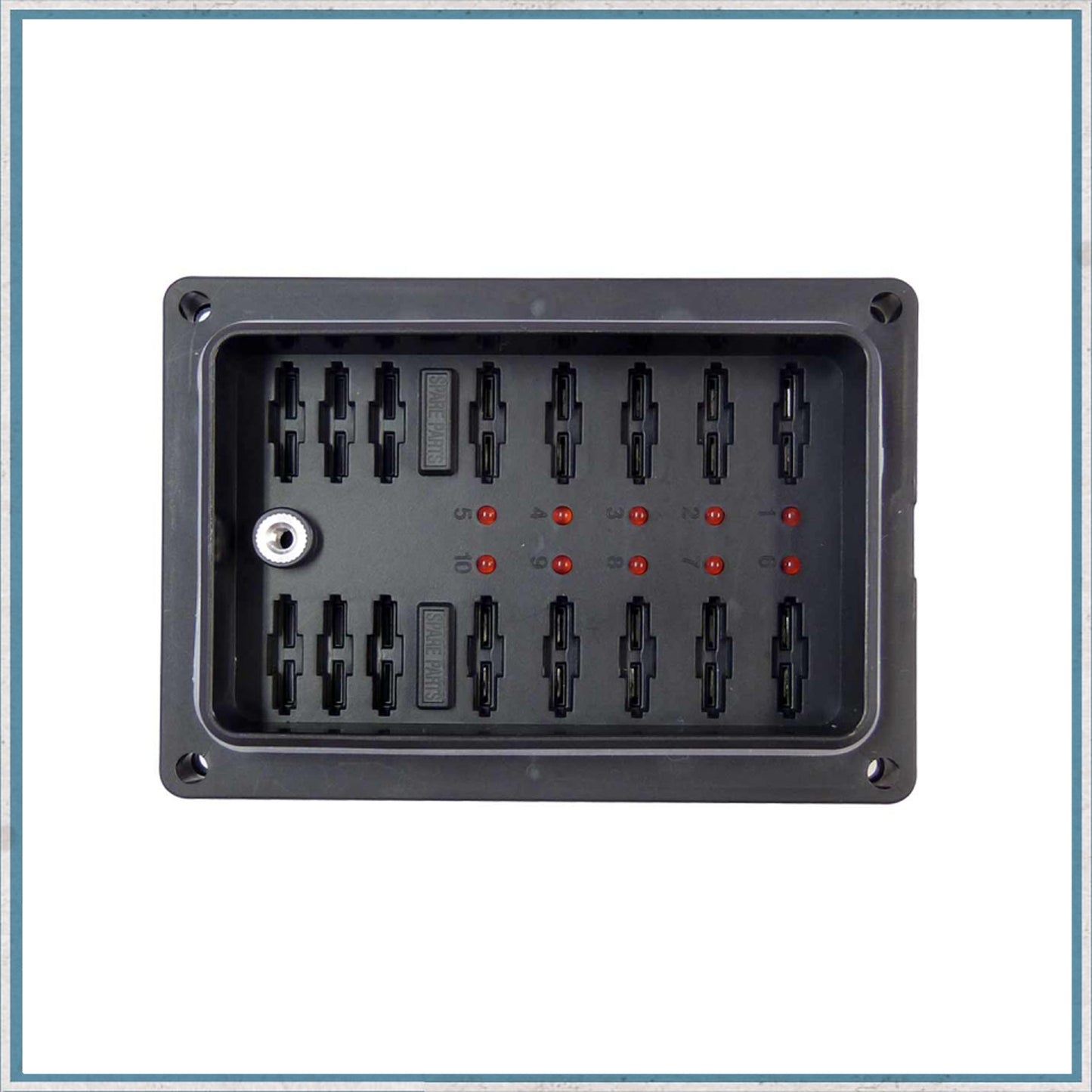 A superb quality compact weatherproof ATC fuse block for 2 independant banks of 5 fuses with red failure indicator light for each fuse and a further 6 slots for spare fuse blades.