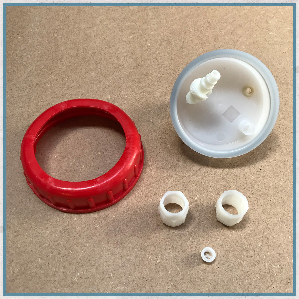 The integrated version has a hole for the cable, but then pipe clamps built-in to it to let you securely clamp the external hose to the outside of the lid, with a shorter length of hose then going to the pump. It also has a one way valve to let air into the bottle, but to reduce the chance of any spillage, if you are driving on uneaven ground.
